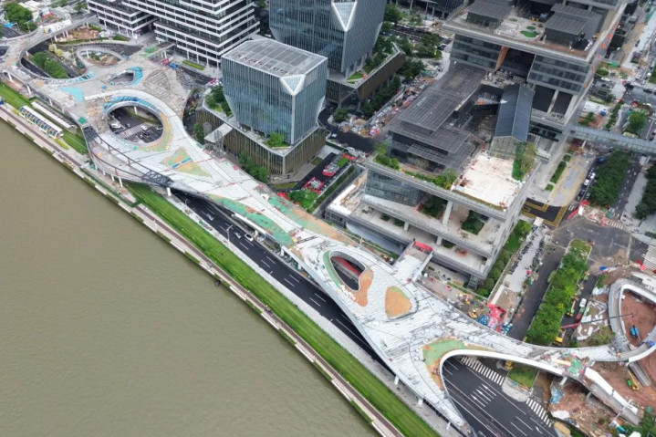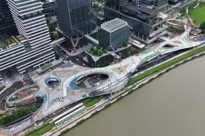 琶洲西区滨江立体人行交通工程主体结构顺利合龙,进入最后冲刺阶段,预计7月底整体完工。