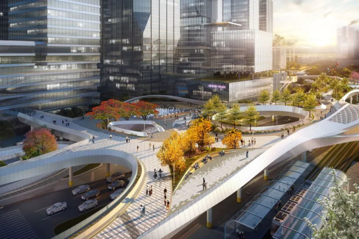 地面首层与有轨电车、公园、交通站场、水巴码头等连接;